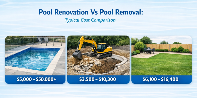 Cost is often a major factor when deciding between renovation and removal. Renovating a pool may appear more affordable initially, particularly if the structure is still in good condition. However, repairs and maintenance may still be needed over time.